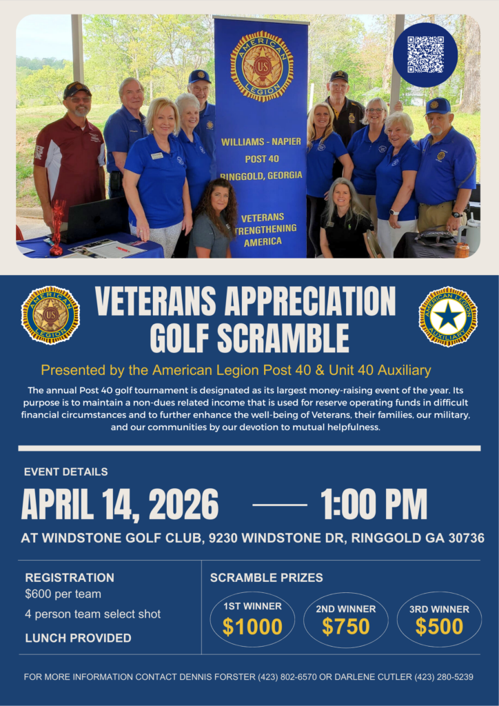 Post 40 Golf Sponsorship Opportunities are attached; there are many ways to support the Post 40! If you can’t come and play, advertise your business by donating door prizes, silent auction items, and goody bag items.